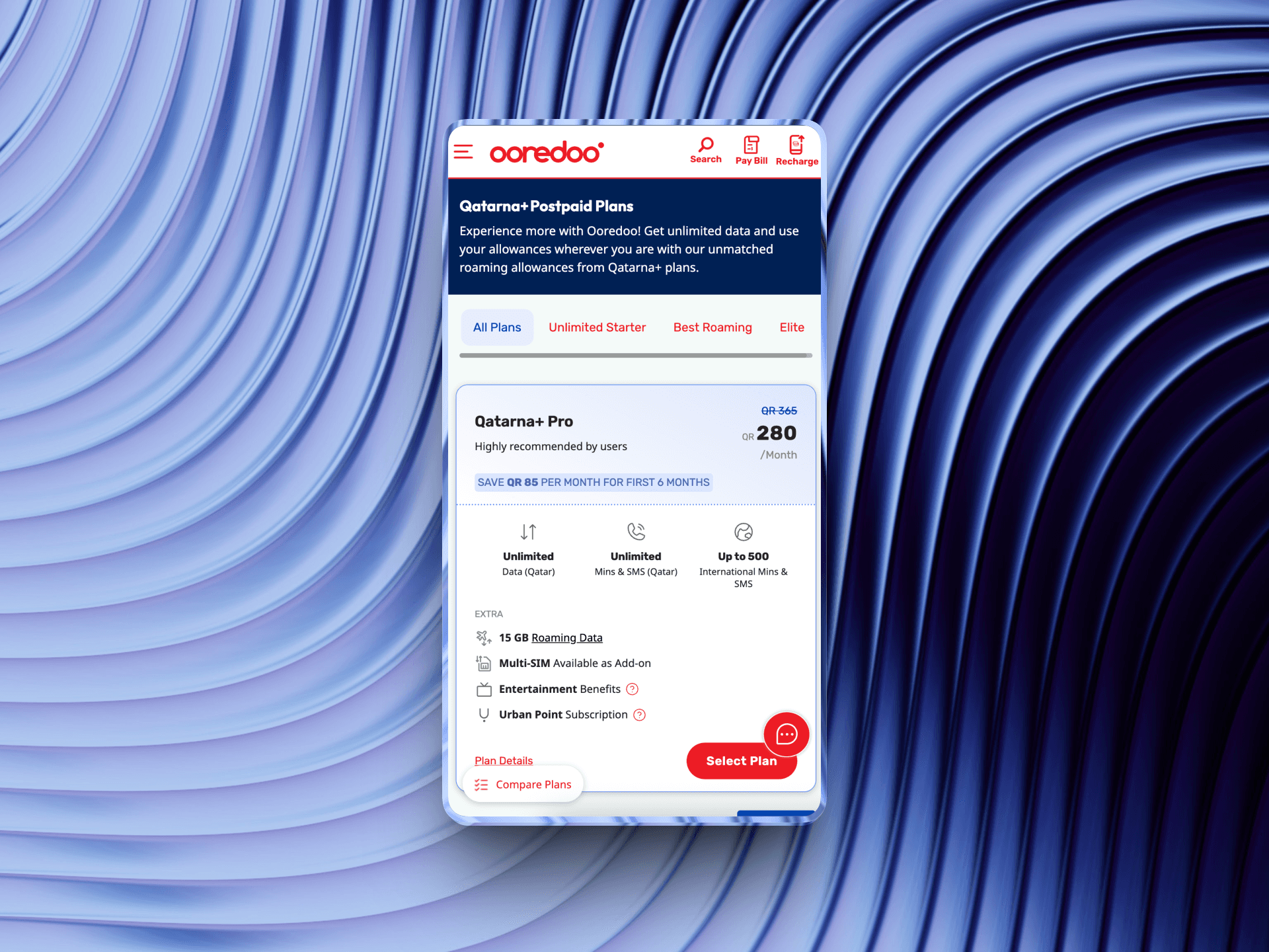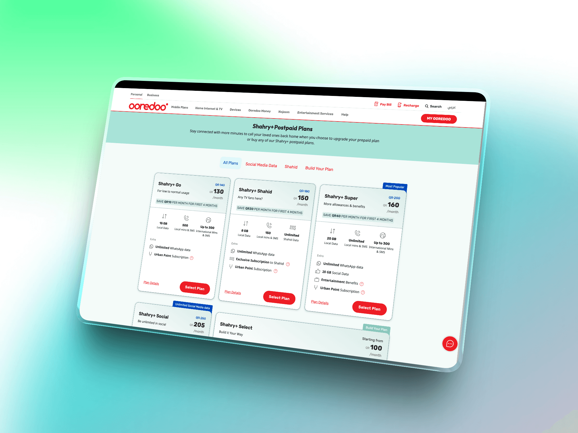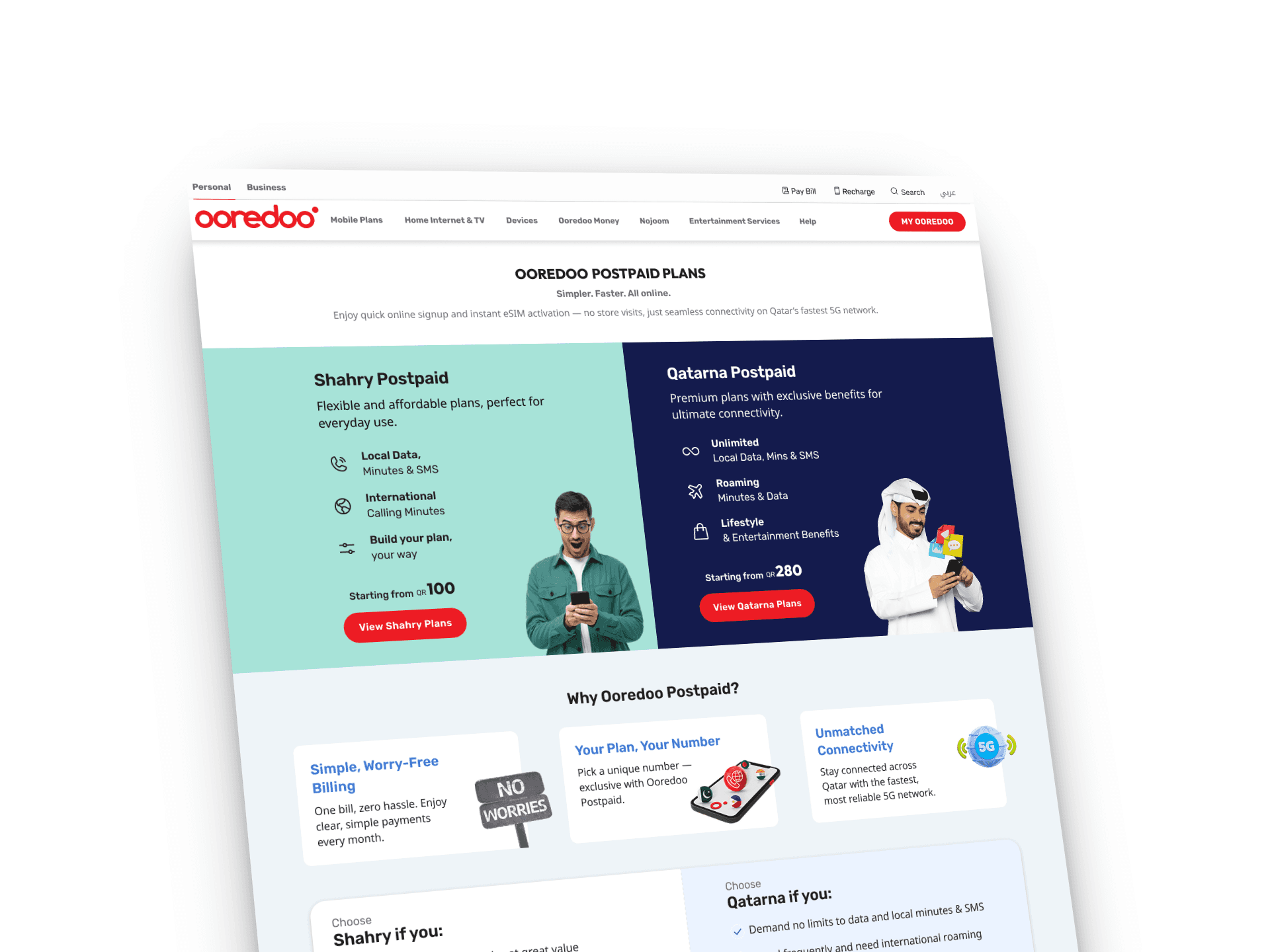 The hero banner was moved below the fold. Shahry and Qatarna became the first things users saw on arrival. Each product received a distinct visual identity built from the persona data. Shahry in teal green, positioned as flexible and affordable for everyday use with local data, calling minutes and a build-your-own-plan option. Qatarna in deep navy, positioned as premium with unlimited data, roaming and lifestyle benefits